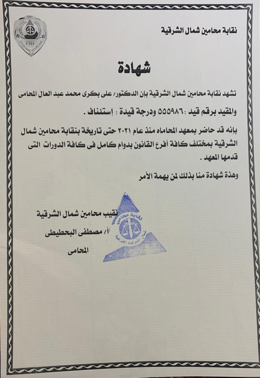 محامٍ لدى جميع المحاكم الجنائية.